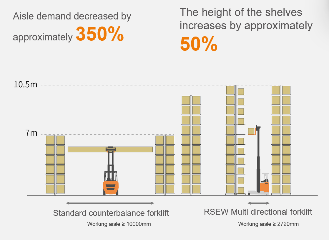 إن الرافعة الشوكية متعددة الاتجاهات RSEW هي رافعة شوكية يتم تشغيلها من وضعية الجلوس، وهي مناسبة لتكديس المواد الطويلة التي يتراوح طولها بين 3 و10 أمتار (مثل القطاعات المعدنية والصفائح والألواح الزجاجية والأنابيب وما إلى ذلك)، وتتميز بتوجيه 360 درجة مع جميع العجلات وارتفاع رفع أقصى يبلغ 10.5 متر.