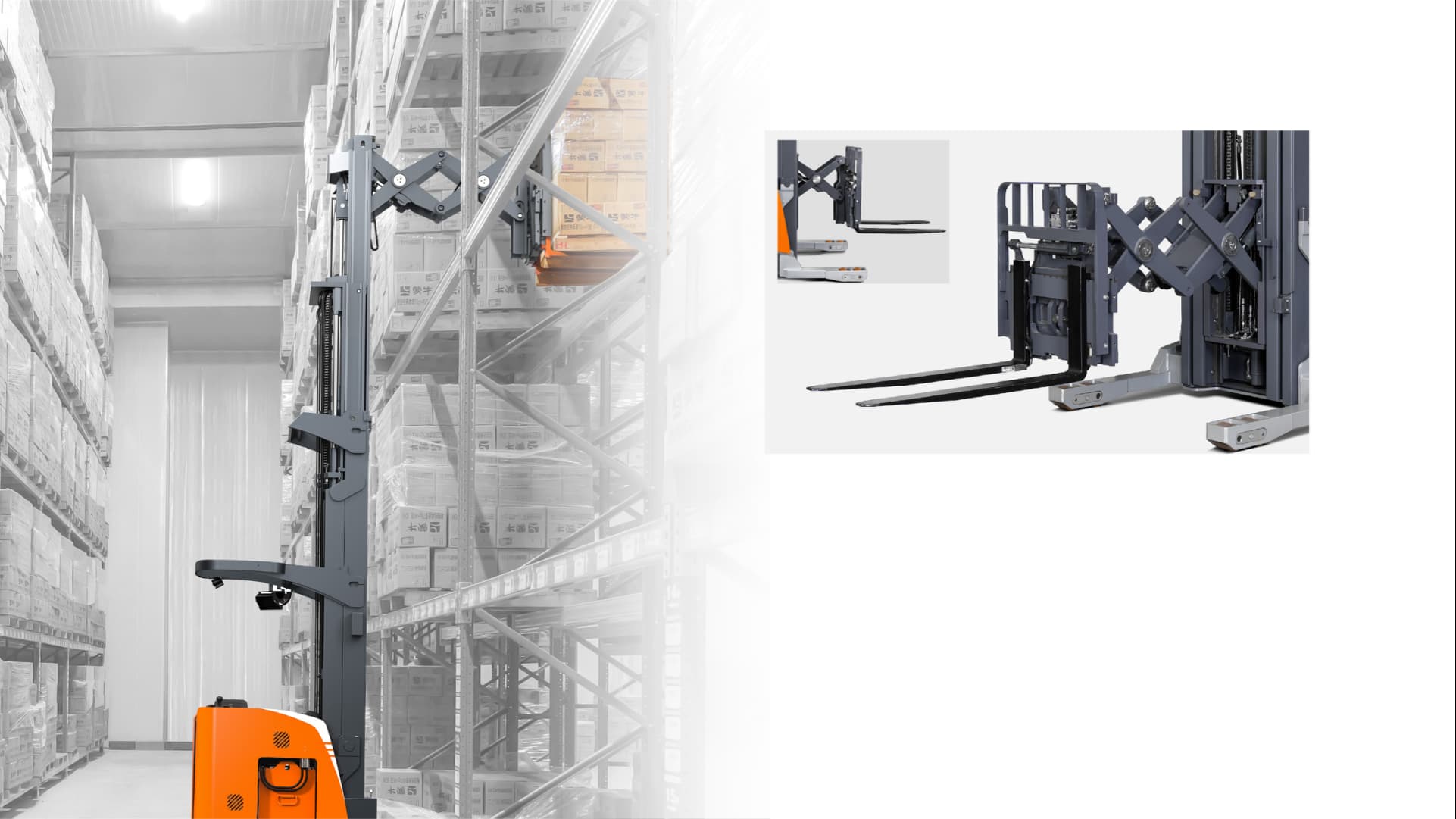 تتيح آلية المقص المرنة أقصى مسافة حركة أمامية تبلغ 1030 مم ومسافة حركة جانبية تبلغ ±50 مم، مما يسهل معالجة التحديات المتعلقة بعمق التكديس.
