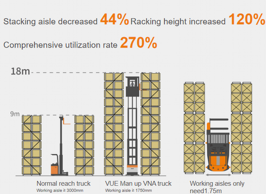 يتميز الجيل الجديد من VUE بارتفاع رفع أقصى مثير للإعجاب يبلغ 18 مترًا وحمولة قصوى تبلغ 1600 كجم، كما أن عرض الممر الضيق للغاية الذي يبلغ 1.75 مترًا يزيد بشكل كبير من استخدام مساحة المستودع، مما يجعله أكثر قيمة.