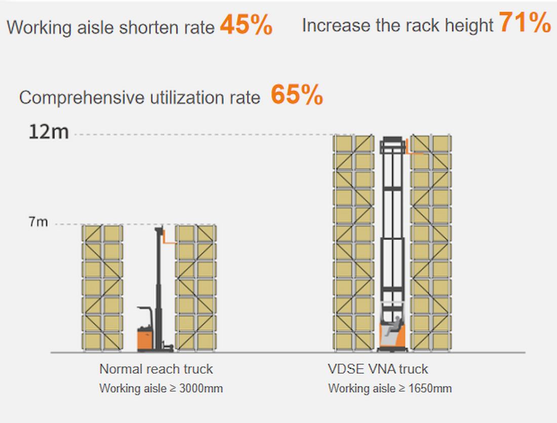 بفضل ممر عمل بعرض 1650 مم ومركز تحميل بعرض 600 مم، يُمكنها التعامل بسهولة مع مختلف أوضاع التكديس. كما أن طراز VDSE، المُجهز بشوكات دوارة كهربائياً بزاوية 180 درجة، يُسهّل عملية التقاط البضائع ووضعها بشكل كبير.